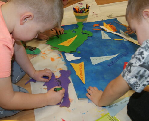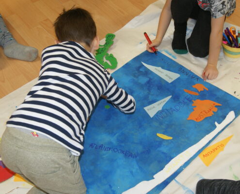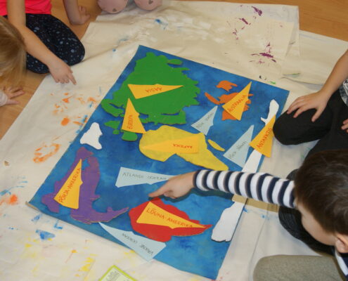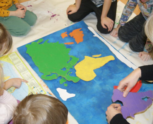Jaanuarikuu tegevused ja mängud pühendasime maailma avastamisele. Nii valmis ühe tegevusena Muumide rühma ühistööna maailmakaart. Vaatlesime ja uurisime, maalisime, kleepisime, häälisime, lugesime, kirjutasime ja tegime koostööd.