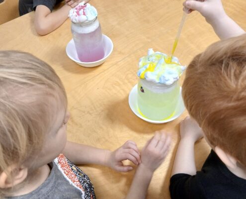 Tegime Pätude rühma lastega katse, kuidas ise vihmapilve teha. Selleks pani õpetaja kahte purki vett ja selle pinnale habemeajamisvahtu, mis nägi välja nagu pilv. Selleks, et “vihma” hakkaks sadama tilgutas õpetaja mõlemasse “pilve” sinist toiduvärvi. Varsti oligi näha õrna “sadu”. Et asja põnevamaks teha said lapsed ühte “pilve” pipetiga kollast ja teise “pilve” punast värvilahust lisada. Tulemuseks oli sadu, mis ühes purgis oli rohelist ja teises lillat värvi.