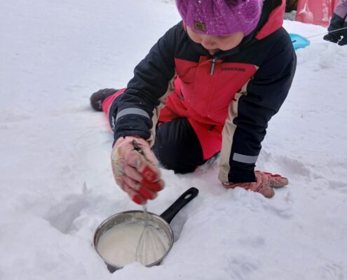 Proovisime lastega valmistada õues lumehanges jäätist teha. Selleks panime potti vahukoort ja tuhksuhkrut. Lumehange vajutasime süvendi kuhu sai poti panna ja süvendisse veidi soola. Lapsed said vispliga koort vahtu ajada ja külma käes õnnestus see päris hästi. Jäätis ise maitses ka lastele väga, seda enam, et seda sai koos iseküpsetatud koogiga süüa.