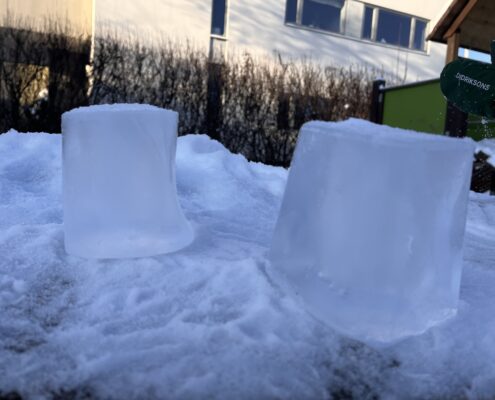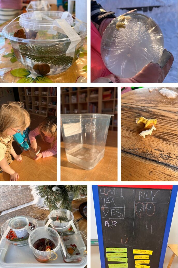 Läbi loovtöö uurisid lapsed vee omadusi ning kuidas tekib jää. Valmisid efektsed vitraažid lasteaia õueala kaunistuseks.