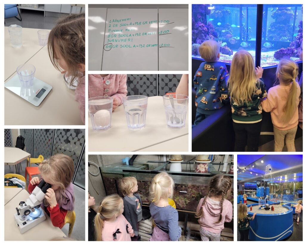 Käisime lastega AHHAA keskuses vee saladusi avastamas. Lapsed tutvusid vee soolasusega ja tegid läbi huvitava katse vee, soola ja munaga. Lapsed said teada, et soolases vees ei vaju nii kiiresti põhja või jäävad asjad vee pinnale hulpima. Lisaks uuriti mikroskoobiga soola, liiva, samblikke ja koralle. Lapsed tegid koos juhendajaga ringkäigu AHHAA keskuses ja uurisid veega seotud eksponaate. Nägime, kuidas korallidega vett puhastatakse, vaatlesime elu akvaariumites ning lapsed said veega mängida.