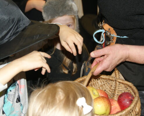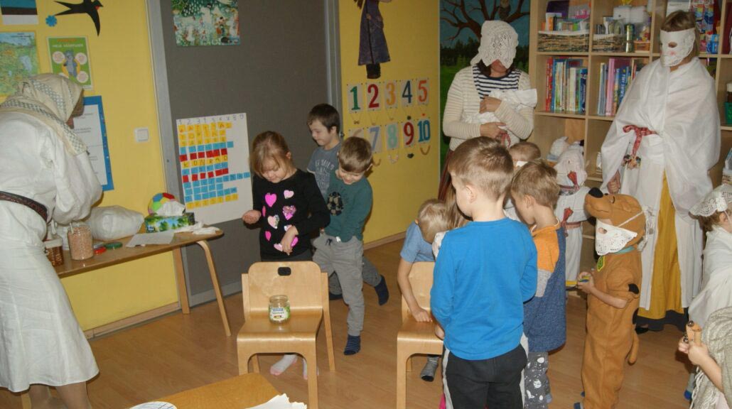 Mardipäeva laulud, mängud ja traditsioonid kestavad. Muumide rühma mardisandid Pätude rühma külastamas.