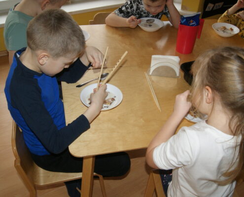 Kuna meie lasteaia töötajate hulgas on üks suur jaapani huviline ja fänn, siis tutvustas ta seda maad ka lastele. Lapsed said kuulda jaapani muinasjuttu, tutvuda jaapani kirja, nukkude ja origamiga. Viisime läbi ka väikese jaapani teetseremoonia ning lapsed said proovida pulkadega söömist.