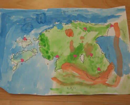 Jaanuarikuu pikad rännakud teistes maades tõid meid tagasi kodumaale. Muumid õppisid tundma Eesti kaarti. Selleks maalis iga laps endale kaardi ning vanemad lapsed märkisid peale ka suuremad linnad, järved, mered ja naaberriigid.
