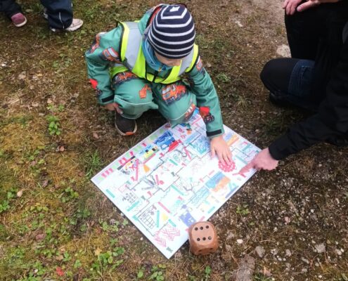 Lõpetuseks mängisid lapsed keskkonnateemalist täringumängu, kus keskkonnast hooliva tegevusega seotud mänguväljale sattudes tuli teha kaaslasele pai, aga keskkonnakahjuliku tegevusega seotud mänguväljale sattudes kükitada 2 korda.