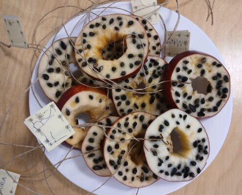 Pätude rühma lapsed meisterdasid lindudele toidurõngad. Selleks oli vaja õunu ja koorimata päevalilleseemneid metsa- ja aialindudele. Lapsed said õppida õuna lõikamist viiludeks ja õunasüdamiku eemaldamist. Edasi said kõik lapsed päevalilleseemneid õunaviilu sisse vajutada. See tegevus võttis päris palju aega. Kõige lõpus panid lapsed õunarõngast nööri läbi. Vanemad lapsed said harjutada nööri sõlme tegemist, noorematel lastel aitas seda teha õpetaja. Rõngad riputasid lapsed õue puude- ja põõsaste okstele, et linnud sealt seemneid kenasti nokkida saaks.