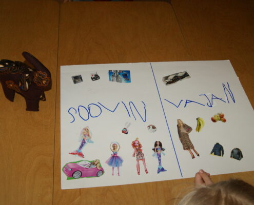 Arutlesime lastega, millised asjad on eluks vajalikud ning millised asjad on need, mida tahame, kuid tegelikult ei vaja.