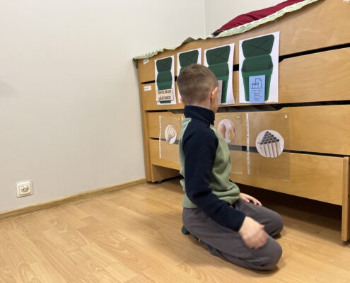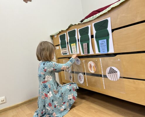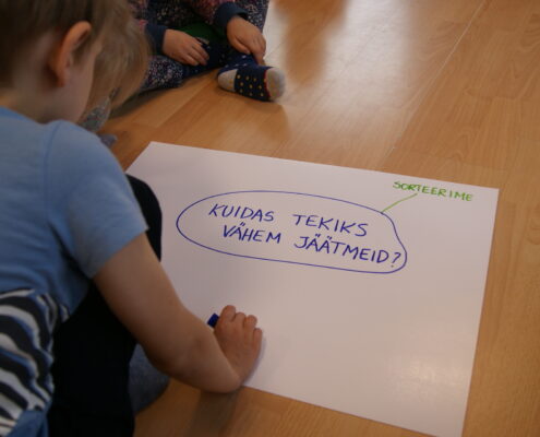 Muumide rühma lapsed õppisid jäätmete sorteerimise vajalikkuse kohta ning said teadmisi, mis saab jäätmetest edasi. Lapsed said erinevatele jäätmetele leida õige asukoha. Lisaks vaatasime koos lastega üle, kuhu lasteaias erinevad jäätmed käivad ja mida eraldi kogutakse.