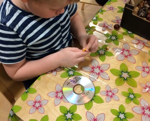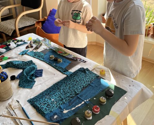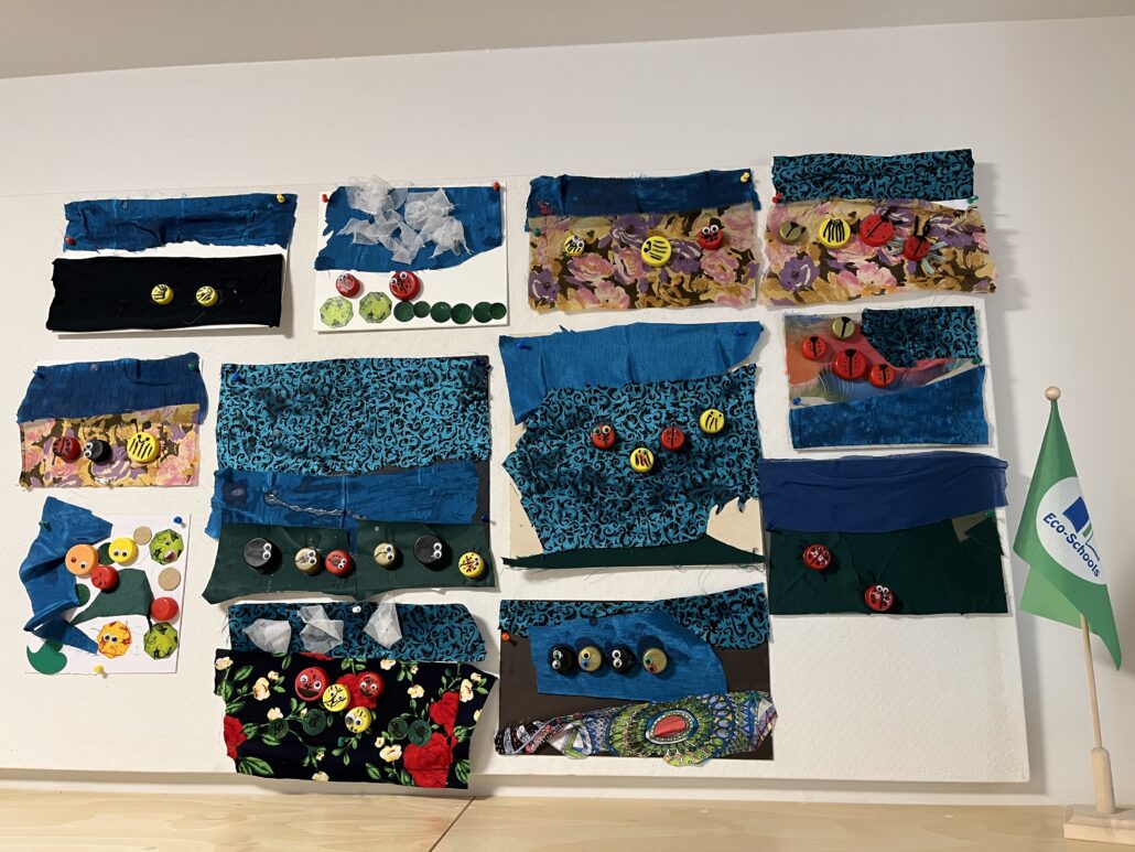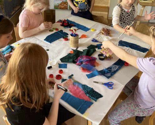 Uurisime ja õppisime Muumide rühmas putukaid, mis kajastus ka kunstitöös. Kasutasime kleepetöös riidejääke ja pudelikorke.