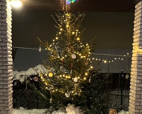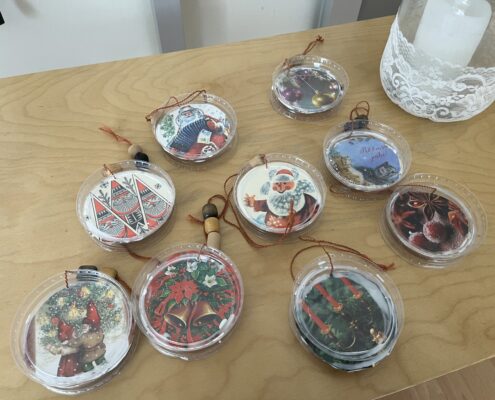 Meisterdasime Muumidega vanadest postkaartidest ja plastkaantest jõuluehted, mis hiljem sättisime õue jõulupuud ehtima.