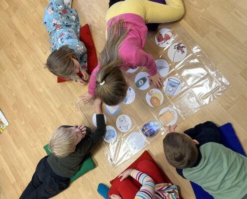 Vanemad lapsed ladusid pudelikorkidest pandipakendi märgi. Eelnevatel päevadel olime vaadelnud pudeleid ja rääkinud, mida erinevad tähed märgil tähistavad.