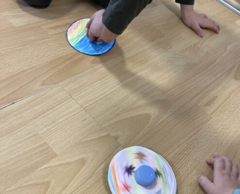 Muumid meisterdasid endale vanast CD plaadist ja pudelikorgist uue mänguasja – vurri.